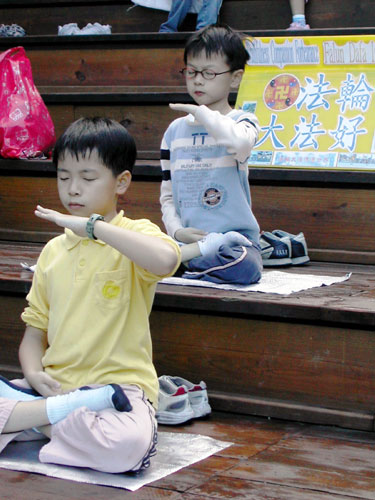 赵永盛小朋友的妈妈则是告诉记者说,虽然她的孩子今年暑假才刚刚学炼法轮功,但是接受度很高,毕竟小孩子需要有一个规范行为的标准,就象“真、善、忍”的准则一样,父母都觉的人格的培养很重要,但这些在普通的学校并没有教。永盛则是告诉记者阿姨说,他觉的法轮功的书(《转法轮》)里所讲的话,让他一看到就觉的很有道理,修炼很好!
