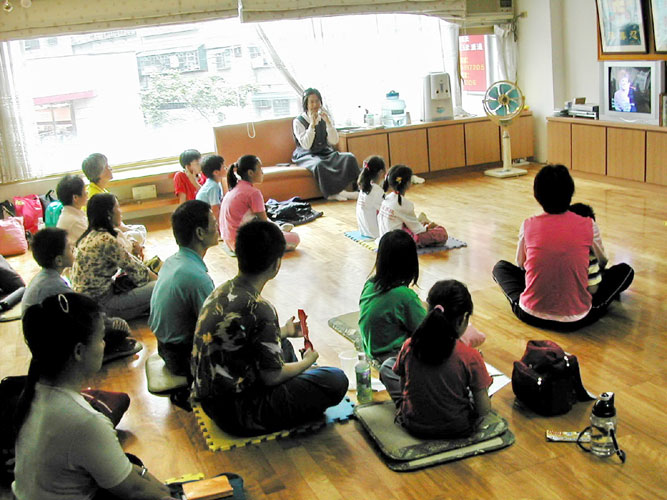 现场有两位辅导员仔细尽心的指导动作,法轮功适合阖家老小入门习炼。