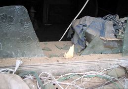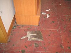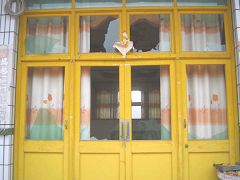 答:紧东边儿那块儿窗户都是着那砖头子揍的,碎了、那砖头子!