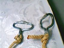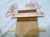 把辐条从中间对折(中间留孔),用钳子掐住对折的底部(掐住的部份稍大于木条厚度),再把上面的辐条向两侧掰,并做成椭圆形(椭圆形和钳子掐住的小圈不在同一个平面,互相垂直),把绳系在小圈上,并把小圈插進木条缝里,使绳在上板的一侧,椭圆形在木条一侧。上板两侧各做一个。如图一。