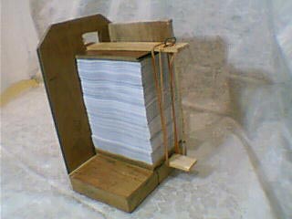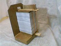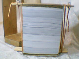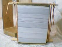 先把下板平放在底板上,使木条穿过侧板开口,并使下板两边和前板、侧板紧贴(木条一面在下),然后把裁好的九评放在下板上(刷胶的一面靠前板),再把上板放在上面(上板的板在下、木条的一面朝上),再用前板、侧板把九评找齐,找齐后摁住上板,用绳绕上下木条两圈拽紧,然后缠在上木条一圈后,把绳绕在椭圆形和木条之间(椭圆形和木条会把绳掐紧,绳不会松开),两边都绑好后,把九评从支架上拿出来刷胶。胶不太干的时候把绳子松开,把九评一本本分开,用稍比书的厚度宽的双面胶贴在书脊上,再把封面贴上,并顺着书脊的棱撸两下,这样九评就做出来了。
