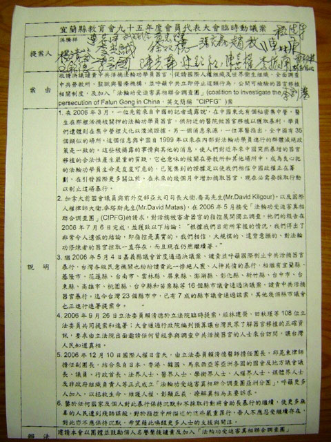 提案人慧灯中学洪校长表示:鉴于任何国家及个人对此暴行保持沉默和不采取行动都将助长暴行的继续,使更多无辜的人民遭到残酷谋杀。对于中共活摘法轮功学员器官的严重罪行,吾人不应忍受继续存在,对此亦不应保持沉默,希望借此决议案,唤醒更多各界人士的支援与关注。