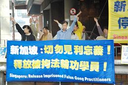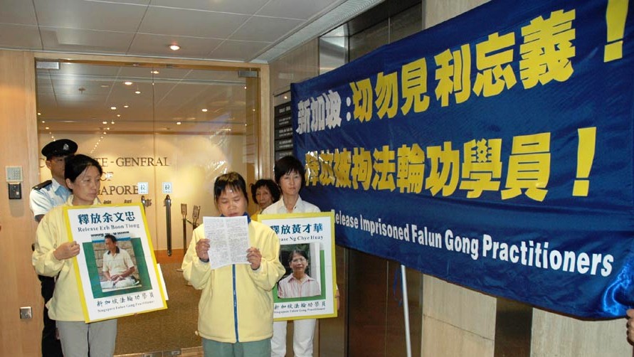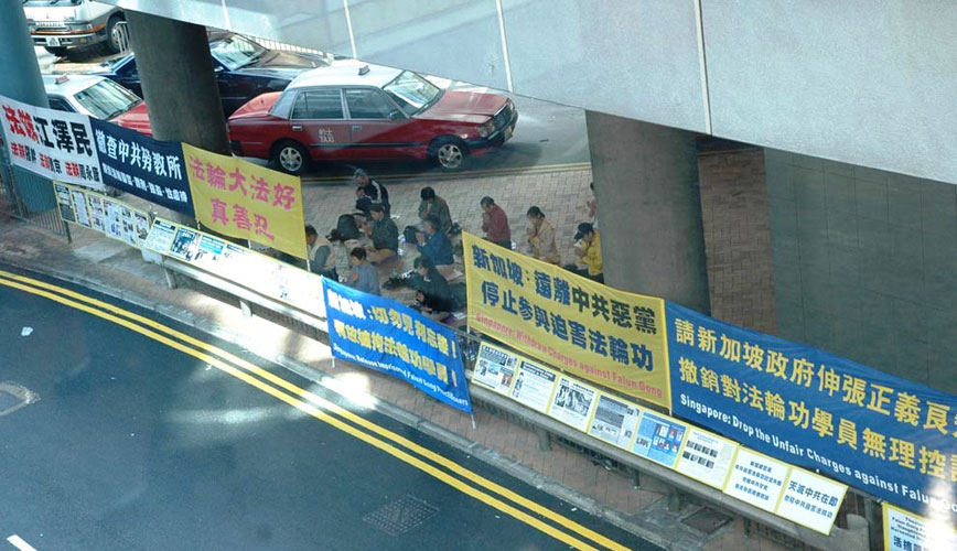 ![]() 法轮功学员在新加坡驻香港总领事馆外张起横幅,呼吁新加坡当局勿做中共帮凶。 |