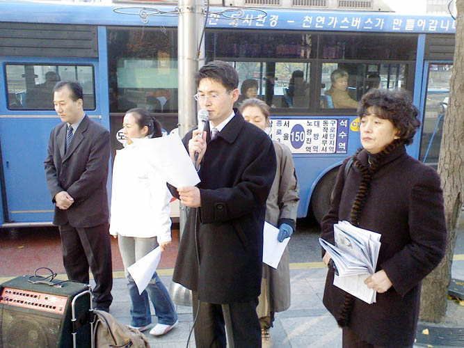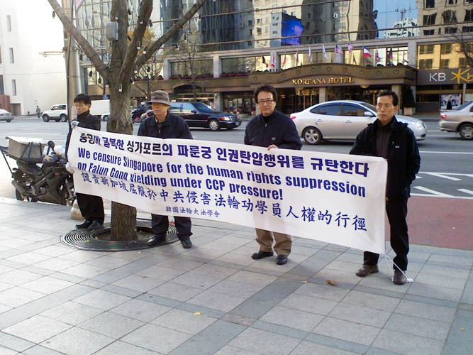 原定于下午两点举行的记者招待会由于大使馆警备人员的持续妨碍,推迟了一个半小时才开始,气温也骤然降至零下。但学员们突破障碍,坚持举办活动,并朗读了声明。声明书中谴责了新加坡法庭无视事实,做出不公正判决,将两位在中使馆前和平抗议的法轮功学员逮捕入狱。全体韩国法轮功学员强烈要求新加坡政府立即撤销这种错误判决,不再做中共邪党的帮凶。