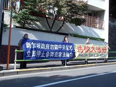 ![]() 部份日本法轮功学员在驻日新加坡大使馆前抗议 |