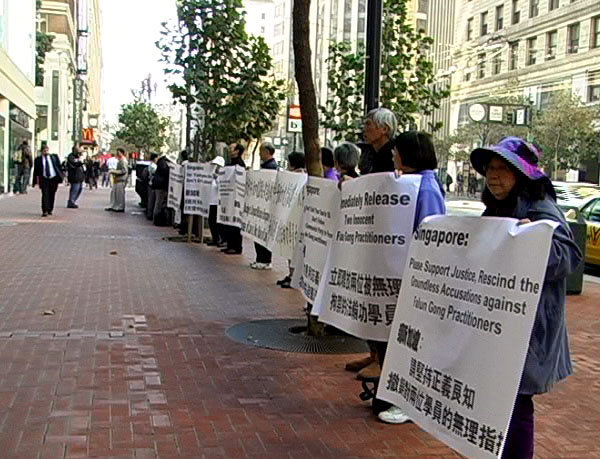 【明慧网二零零六年十二月八日】(明慧记者黄凯莉旧金山湾区报导)自媒体在上周披露新加坡法庭对两位因在中国驻新加坡大使馆外和平抗议而被拘捕和指控的法轮功学员进行草率结案后,二零零六年十二月六日上午,湾区的法轮功学员来到新加坡驻美国旧金山的领事馆递交请愿信,要求新加坡当局勿见利忘义为讨好中共而滥用法律迫害法轮功学员,立即释放被无理指控和拘禁的两位学员,并撤销对他们的指控。学员们还向过往行人讲诉此不公事件。
