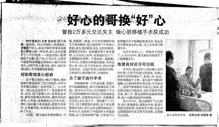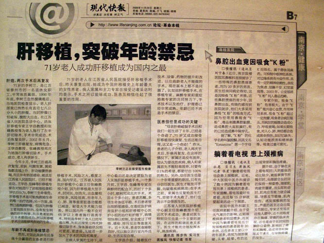 在短短的一个月的时间里医院就为其找到了合适的供体,让人怀疑供体器官的来源是否合法。这篇新闻的报道记者为:张加汲,摄影:首席记者 郑磊雷。该版编辑:胡晓农,张喜梅。