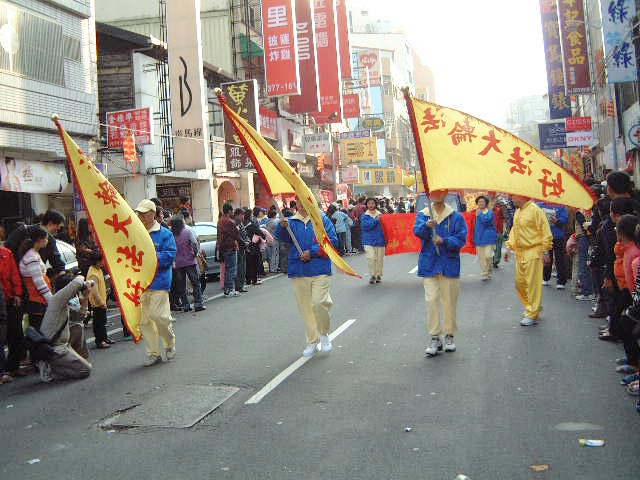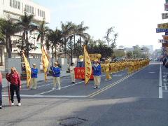深受苗栗民众欢迎的“法轮大法神威腰鼓队”的庞大阵容展现在队伍中。他们精神抖擞,动作整齐,让两旁的观众看的聚精会神,由于在队伍最后压阵,后面又有警车跟随,震撼之余,更显得与众不同。