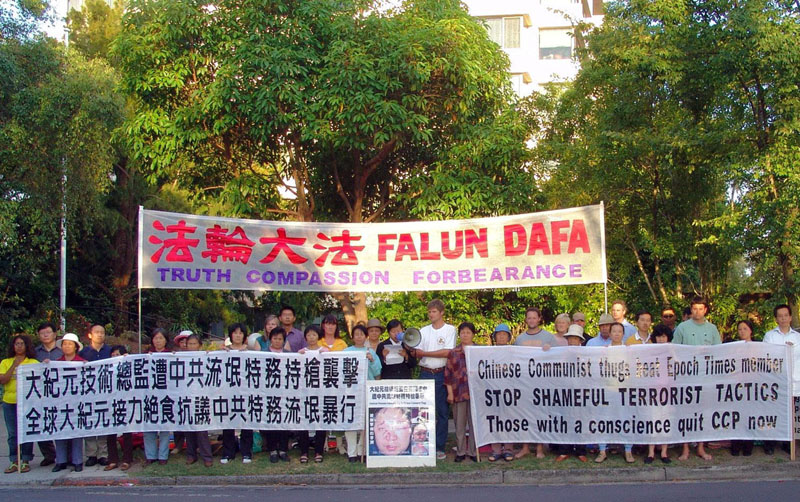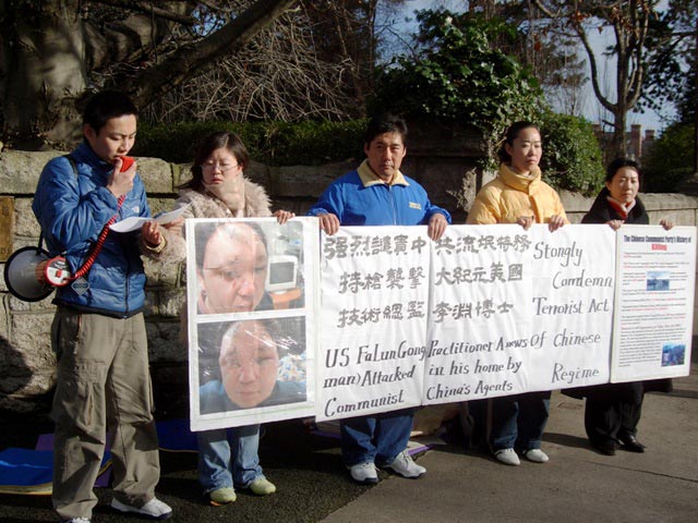 2006年2月15日傍晚时分,澳大利亚墨尔本法轮功学员在中领馆门外举行抗议活动,抗议中共流氓特务对海外法轮功学员所采取的黑帮行径,抗议活动在晚上9时后结束。