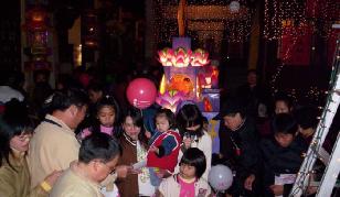 ![]() 点灯仪式后,人潮蜂拥而上欲抢先进入总兵署内观赏花灯,门口顿时水泄不通 | ![]() 金门乡亲井然有序的排着队,等着领取印有“法轮大法好”字样的气球 |