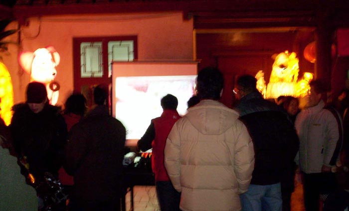 在总兵署入口的墙面,学员们架起了大萤幕,影片一片片的播放,有缘人一个个的走近,也更了解大法的洪传及在中国的不人道迫害。正播到反迫害的画面时,一位小男孩目不转睛的盯着萤幕看了许多,专心而沉稳,特别引人注目。
