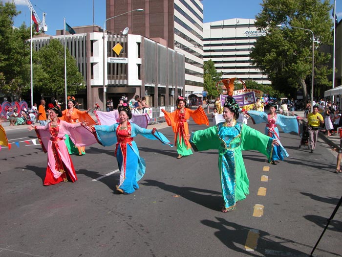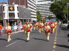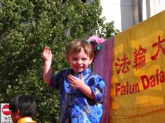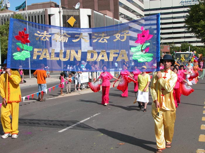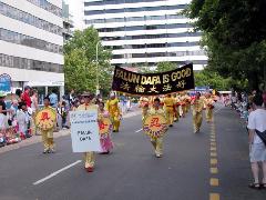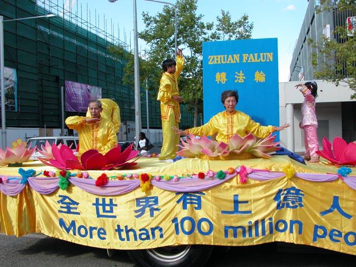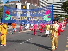 法轮大法团体的阵容强大,由腰鼓队、扇子舞队、花车、唐装队等组成,150多名法轮功学员参加了游行,沿路受到围观市民的欢迎。主席台的广播员向观众介绍法轮功时说,这是此次游行中最庞大的队伍。游行结束后,评委宣布获奖名单。法轮功学员的队伍获得“最佳主题奖” (Best Theme)。