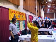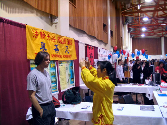 法轮功学员们也再度借此机会向更多的人们展示大法的美好并揭露中共六年多来残酷迫害法轮功修炼者的真相。伴随着优美的音乐和解说,学员们为观众表演了五套功法,并在摊位上向游客讲真相。