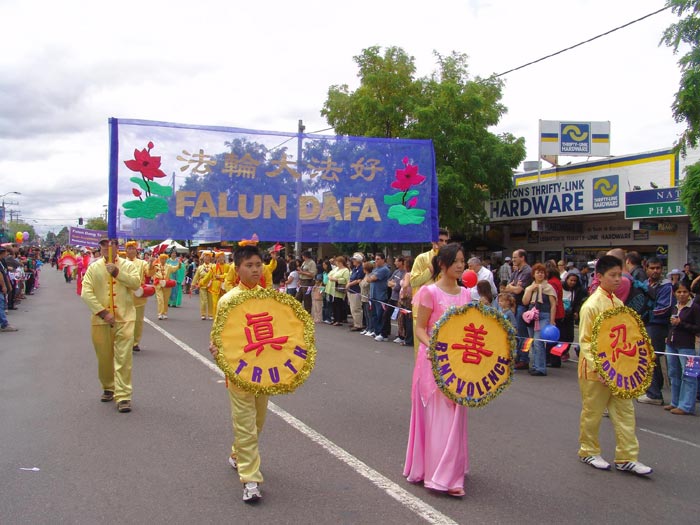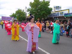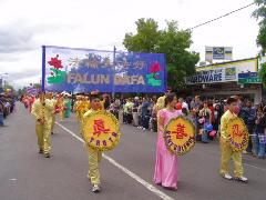 法轮大法学员的队列是游行队伍中最后压阵的,由腰鼓队、唐装队、扇子舞队组成,色彩缤纷,气势不凡。一位西人男子情不自禁的说“好美的色彩!”还有一位带有台湾口音的女子说:“他们看起来很祥和、优美。”
