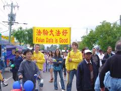 ![]() 法轮功学员的展位 | ![]() 法轮功学员多彩的游行队伍 |