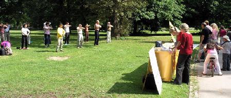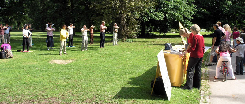 德国人走过炼功点,通常是瞥几眼就目不斜视的走过去了,他们觉得盯着看很不礼貌。要是真感兴趣,大多数德国人一定是远远的观察着,看你炼完了再和你搭讪,不过这和他说出“我也来炼功”还差得远呢,他得先拿一张传单,原地站着细细的读一遍,不懂的再问问,回家查查相关网页,如果还感兴趣,有可能再来借本法轮功的书或者从网上下载一本攻读一番,一直到心里十拿九稳了,才开始认认真真的学功,而一旦真的学了,很多人就会学下去。