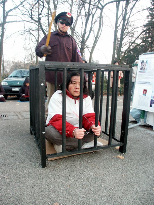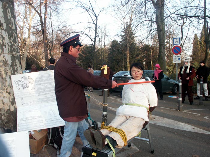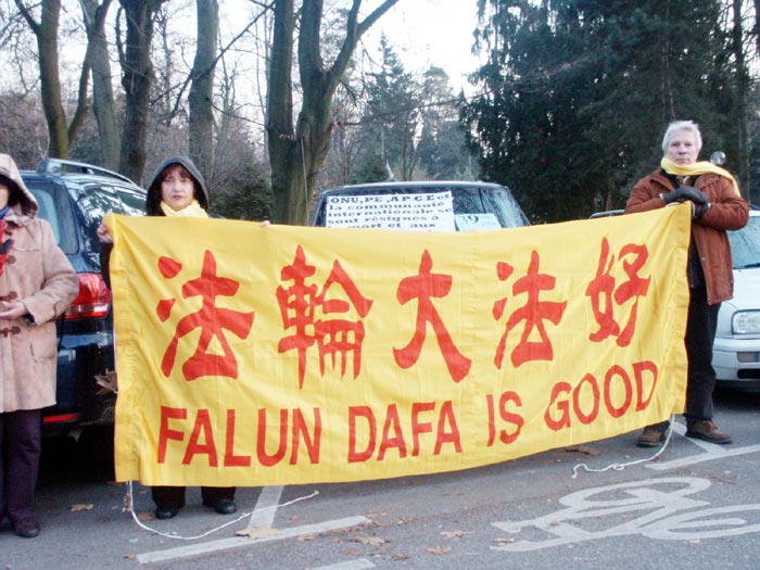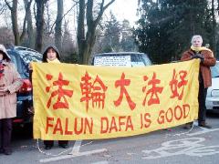 ![]() 谭雅在欧洲委员会前举着横幅 呼吁紧急救援中国法轮功学员 |