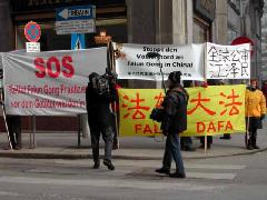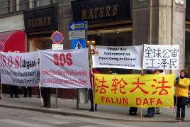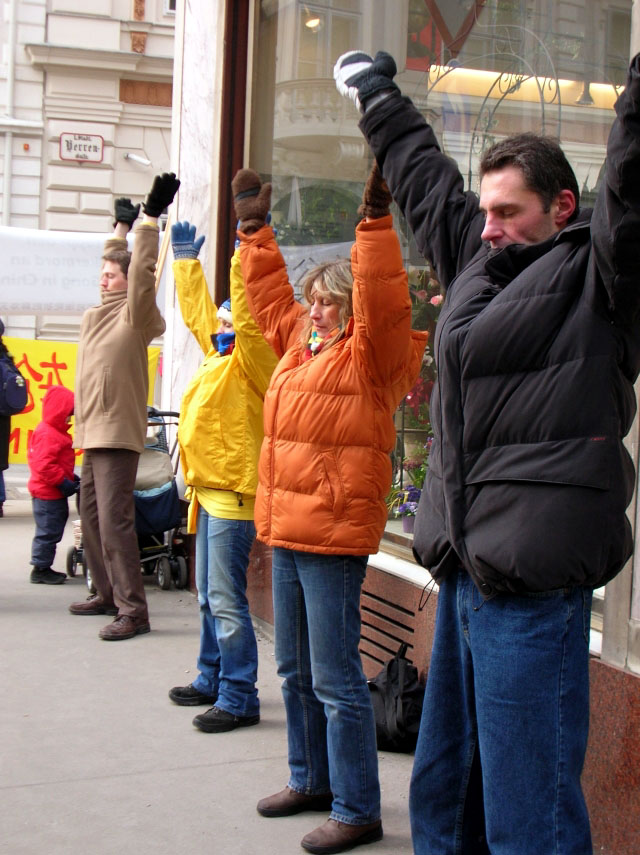 法轮功学员分别在奥地利外交部门外和中国代表团车队要经过的路边,举起横幅并展示祥和的功法。