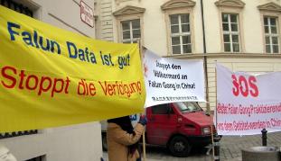 奥地利国家电视台对学员進行了现场采访和录像,在和平抗议活动结束后的2 小时内,就对法轮功学员这次和平抗议活动和中共政权对法轮功的残酷迫害做了报道。