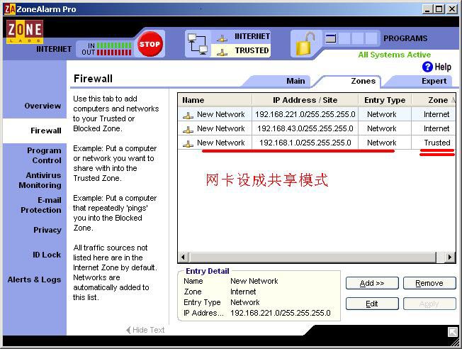 4.使用Bridge方式上网主机ZA(Zone Labs Security)防火墙的设置: