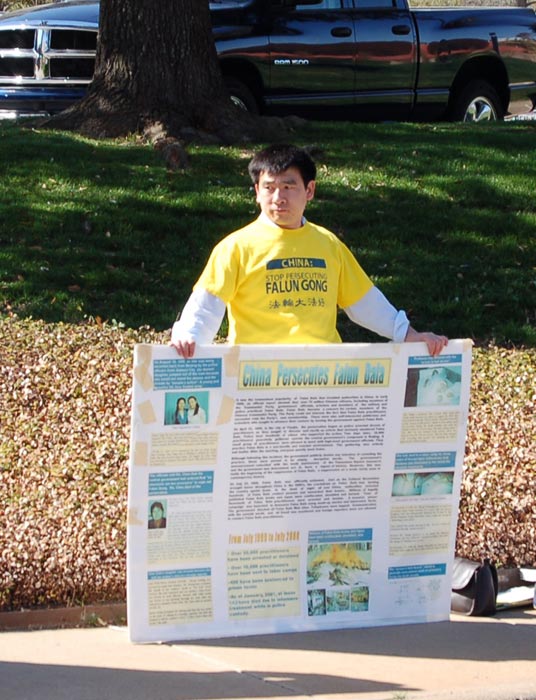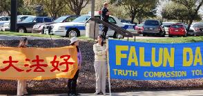 参加抗议活动的张女士说,这里虽然离学员们居住的地方较远,但大家都非常珍惜这个能让更多的人们了解真相的机会,今天来的学员中,有近80岁的老人,也有在附近几个城市上班的年轻人,他们或者请假,或者利用中午休息时间驱车来到这里。张女士还说:“中共驻美大使的午餐会邀请了当地的中西方报纸的记者来参加,当地的最大的英文报纸《达拉斯晨报》(Dallas Morning News)的记者看到了学员的抗议活动,采访并报道了法轮功学员的抗议活动。”