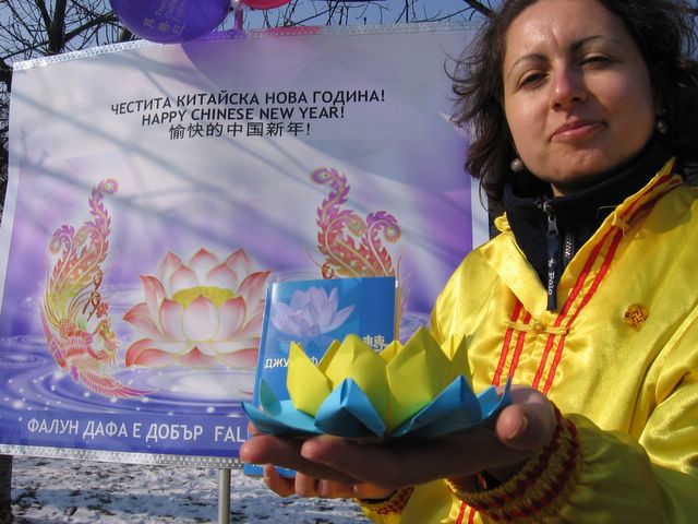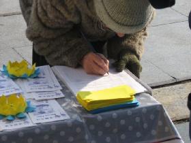 法轮功学员们送给每个路人一朵象征纯洁与美丽的手工制纸莲花,和一张介绍法轮功这个中国古老修炼法门及其如何受到中共政权残酷迫害的真相传单。获悉这场迫害后,许多人在呼吁结束迫害的请愿信上签名,他们对于如此祥和的修炼功法竟遭受这么残酷迫害,表示震惊与愤怒。
