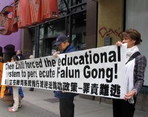 陈至立在7日参加不列颠哥伦比亚理工大学(BCIT)的孔子学院开业典礼期间,法轮功学员打着“停止迫害法轮功”,“陈至立在教育系统推行灭绝法轮功政策──罪责难逃!”等横幅在场抗议。