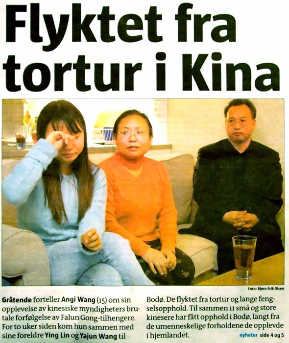 文章说,15岁的王安琪一边哭着,一边讲述着她所经历的这场中共政权残酷迫害法轮功的暴行。两个星期前,她和她的父母刘莹、王亚军来到这座有5万人口的挪威北部城市博德(Bodo)。他们从酷刑和长期监禁中逃离出来。包括他们一家人在内的11名中国人获得了在博德的居留权,他们中有老有少,得以远离在家乡所经历的非人遭遇。