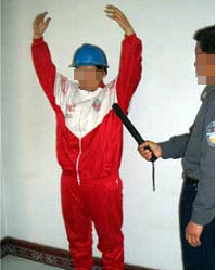 此种酷刑即是迫使法轮功学员大头朝下,两手撑地,两腿向上伸直,倒戳在墙边,由包夹或恶警按住腿、脚,然后由恶警用电棍电击心脏部位,长时间受此酷刑者大多头晕、眼部充血,在电棍的电击下心跳加快,呼吸困难。