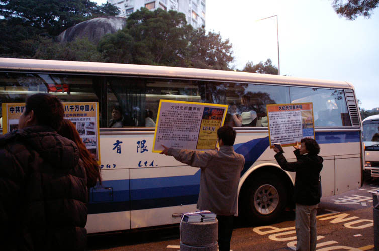 ![]() 中国游客正专注看着法轮功真相 | ![]() 法轮功学员高举真相看板目送中国旅客 |