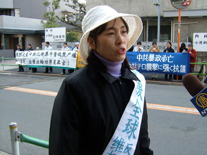 日本法轮大法学会代表莲本女士泪流满面的对记者说:中共残酷迫害法轮功已经7个年头了,被迫害致死的已知人数接近3千人,江泽民叫嚣“打死算自杀”的穷凶极恶迫害下,还不知有多少人被迫害致死而未传出消息!中国的同胞们啊!你们快清醒吧,拿出你们的正义、良知,和我们一起制止这场疯狂的迫害吧!否则,中华民族的将来将毁在这些邪恶手里。