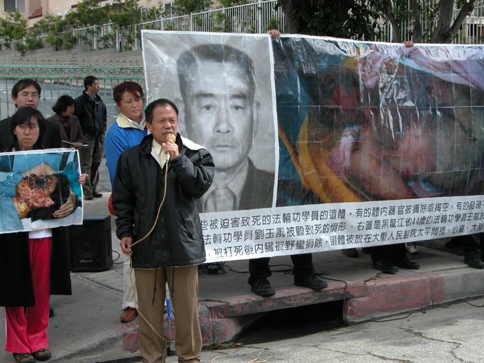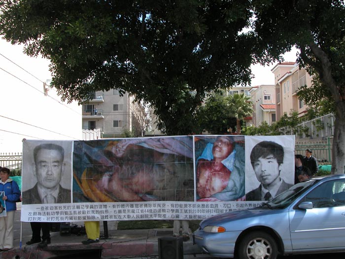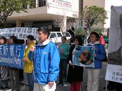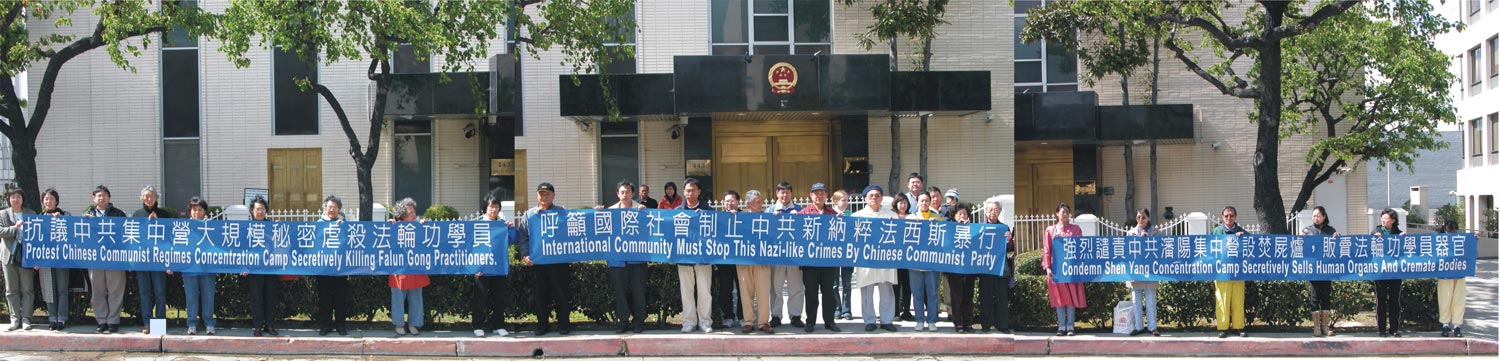 苏家屯集中营惊人黑幕2006年3月8日在明慧网披露出来,立刻引起海外各界的震惊和愤怒,为了抗议中共这一新纳粹法西斯暴行,洛杉矶法轮功学员于2006年3月11日在中共驻洛杉矶领事馆前抗议,强烈谴责中共的血腥罪行,呼吁国际社会调查此事,立即制止中共这一灭绝人性的罪行。