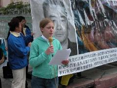 法轮功学员代表吴英年发言。他说:“苏家屯黑幕再次显示中共反人类的一贯特征!它们今天用于关押法轮功的劳教所是当年用于关押右派分子的,它们今天不仅在延用它们,而且再制造新的纳粹法西斯式的集中营。人们从苏家屯黑幕中可以看到中共是比纳粹还邪恶的魔鬼。”他强烈谴责中共反人类的罪行,呼吁国际社会立即调查苏家屯集中营,并制止中共的暴行。他说,自99年法轮功被中共迫害以来,至少有逾十万大陆法轮功学员被绑架进中共的劳教所、精神病院,难以计数的人被劫持进洗脑班,“他们有半数以上是女性,她们是妻子,是女儿,是母亲,她们受到电击毁容、性侵犯等令人发指的迫害。”他还特别提到近期大陆律师高智晟,呼吁社会各界人士支持高智晟律师为法轮功争取人权。他也呼吁人们放弃所谓在中共流氓政权所划定的法律体制内解决人权信仰问题的幻想。最后他说,“就象纳粹是德国人民的耻辱一样,中共是中国人民的耻辱,在全球一体化的今天,中共的存在乃是整个世界人民的耻辱,是人类的耻辱!”他呼吁人们站出来,为正义和真理说话。