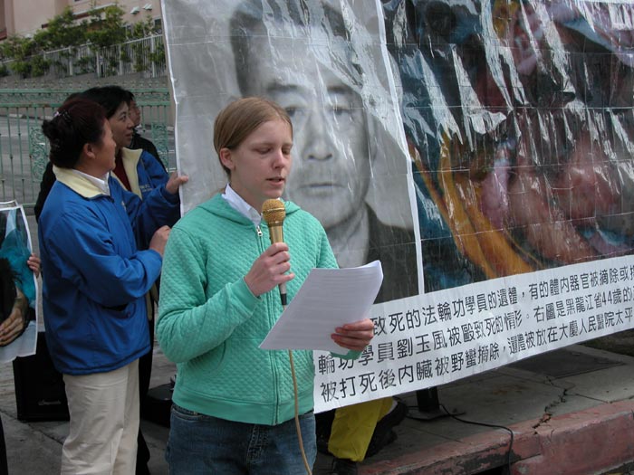 法轮功学员代表李有甫强烈谴责中共这一灭绝人性的罪行,是人类不能容忍的,是中华人民的耻辱,是人类的耻辱,他呼吁所有有良知的人站出来谴责它们,揭露它们,呼吁人们认清中共真实面目,不要做中共的殉葬品。