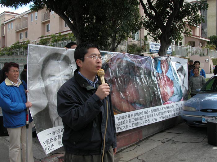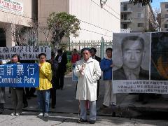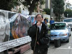 诗人蒋品超今天再次来到洛杉矶中领馆前,抗议中共对法轮功变本加厉的迫害。他说:“今天来这里一是表达对法轮功学员不畏强暴,不惧黑暗的敬意,对因坚持信仰被中共迫害致死的大陆法轮功学员的悼念,这些法轮功学员确实是我们这个时代的中流砥柱,他们是邪恶最害怕的力量,因此所受到的迫害最重,法轮功学员为信仰和真理献身的勇气值得人们的尊敬;再就是我再次强烈谴责中共又一次没有人性的秘密屠杀!对于你们我只有谴责------因为你们一天也没有停止你们的恶行!”他呼吁所有对中共还抱有幻想的人彻底放弃这些幻想,苏家屯黑幕曝光,再次证明中共是没有人性的恶魔!他还特别呼吁国际社会关注和调查苏家屯秘密集中营及其红色血腥下黑幕鬼影,把这些披着人皮的刽子手绳之以法。最后,他呼吁人们不要因为经济利益,放弃自己的良心向中共妥协。