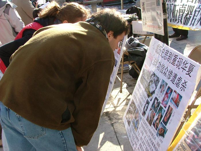 唐人街过往的行人驻足观看学员打出的横幅和被酷刑迫害的学员的照片,就连以往多次匆匆而过的一些华人也停下脚步,久久凝视着被迫害的学员照片,人们被难以想象的事件震惊了。