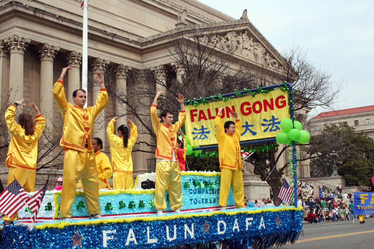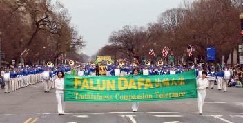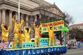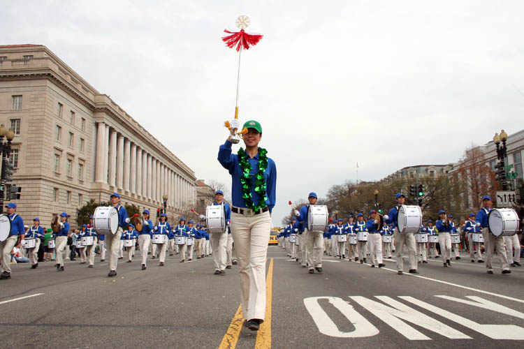 法轮功学员的队伍在整个游行的后半部,三位身着白衣的女学员手持绿色的中英文的“法轮大法-真善忍”横幅走在队伍的最前面,紧随其后的就是由两百多名法轮功学员组成的“天国乐团”军乐队,整个乐团成八路纵队,横贯整个宪法大道,其规模远超过整个游行队伍中所有的军乐队。天国乐团之后是精心装饰的花车,八位各族裔的法轮功学员在上面演示功法,还有六位身着传统唐装彩带的仙女飘逸的舞姿在花车两侧。
