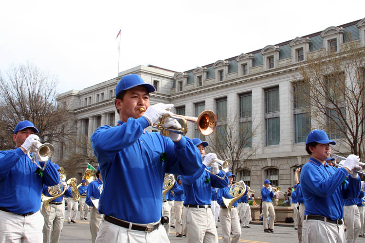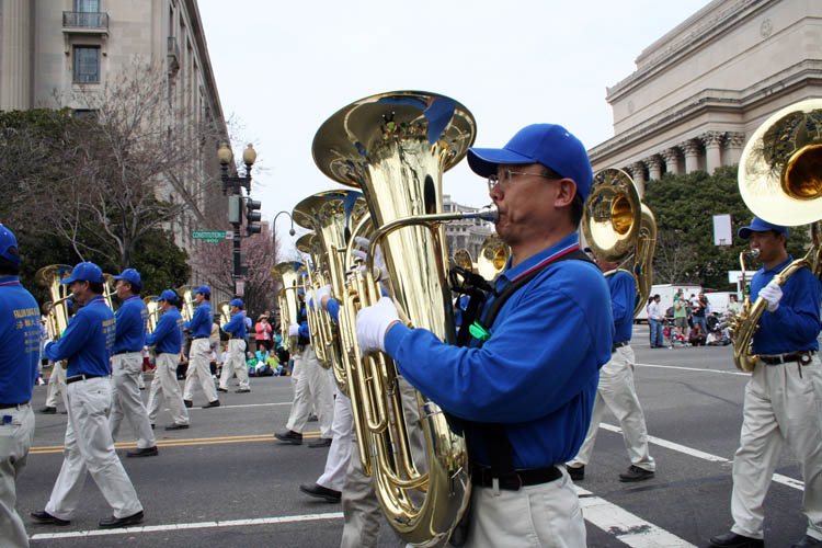 “天国乐团”军乐队以多声部演奏了“法轮大法好”、“美丽的美利坚”等乐曲,在整个游行的沿途获得了无数掌声和欢呼,许多观众随着乐曲的节奏击掌附和。这是“天国乐团”继在纽约中国城、洛杉矶中国城演出之后首次在美国首都闪亮登场。据乐队的指挥之一、原中国中央交响乐团的大提琴演奏家陈汝棠先生介绍说,乐团的演奏越来越好、越来越整齐,越来越有震撼力。