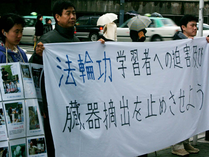 学员们冒着小雨,打着写有“停止对法轮功学员的迫害,停止对法轮功学员进行摘取内脏器官的暴行”的横幅,并举着写有“停止迫害法轮功”等字样的图片,向过往行人说明中共迫害法轮功的真相,及其所使用的流氓手段。过往行人无不被横幅和图片内容所震惊。