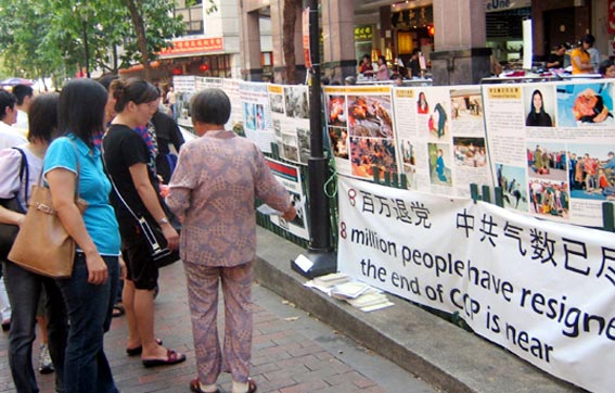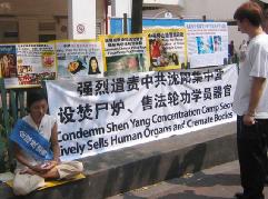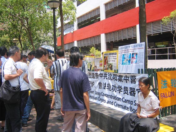 三月的新加坡,骄阳似火。四马路的观音庙前,过往的行人熙熙攘攘,许多人热得汗流浃背。法轮功学员程女士站在展板前,一面为过往的观众解说中共恶党的暴行,一面向公众散发法轮功真相资料和传单。她为了抗议中共恶党的法西斯暴行,绝食了一天。