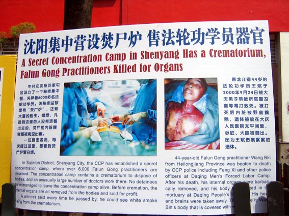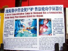 根据明慧网报道,中共恶党在沈阳市苏家屯区的秘密集中营关押了至少6,000多名法轮功学员。该秘密监狱里设有“焚尸炉”,还有大量的医生。据悉,凡進到这里的人没有活着出来的,焚尸前内脏器官都被掏空出售。在上个世纪,曾经发生过以希特勒为首的德国纳粹集团以毒气屠杀了600多万被关在集中营的犹太人,也发生过日本军国主义的南京大屠杀,但是却从未听说过有谁曾把活人的内脏器官掏出出售。中共邪党的残暴尤甚于纣王朝、秦暴政、迫害基督徒的暴君尼禄、杀人魔王希特勒、日本军国主义。只不过邪恶中共还在拼命掩盖自己的罪行,还有很多人没有了解中共的罪行。难怪一个华人看过展板之后说:“共产党比日本鬼子还残忍!”