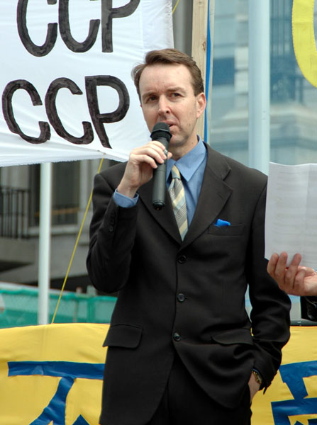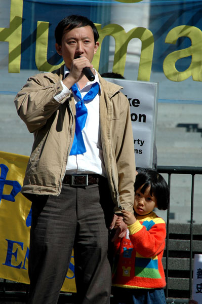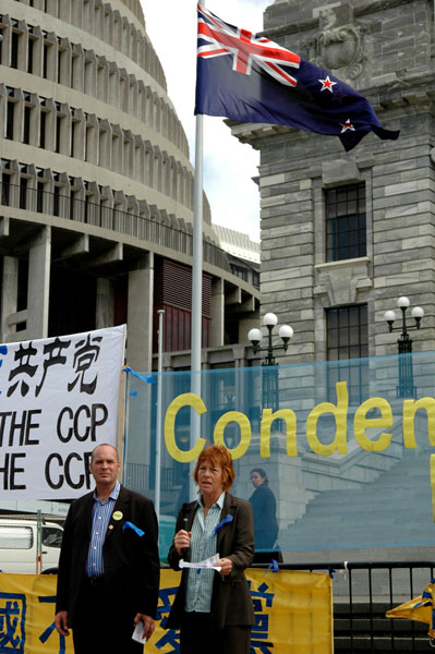 ![]() 中国民主运动新西兰负责人潘晴发言 | ![]() 著名人权大律师凯瑞发言 |