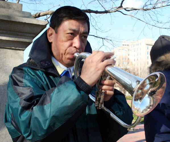 尽管在寒风中冻得发抖,可是关贵敏不停的吹奏小号,有很多人主动上前询问、拍照。他说,他就是要引起人们对“苏家屯”集中营暴行的关注,无论是美国总统,还是普通市民或游人。