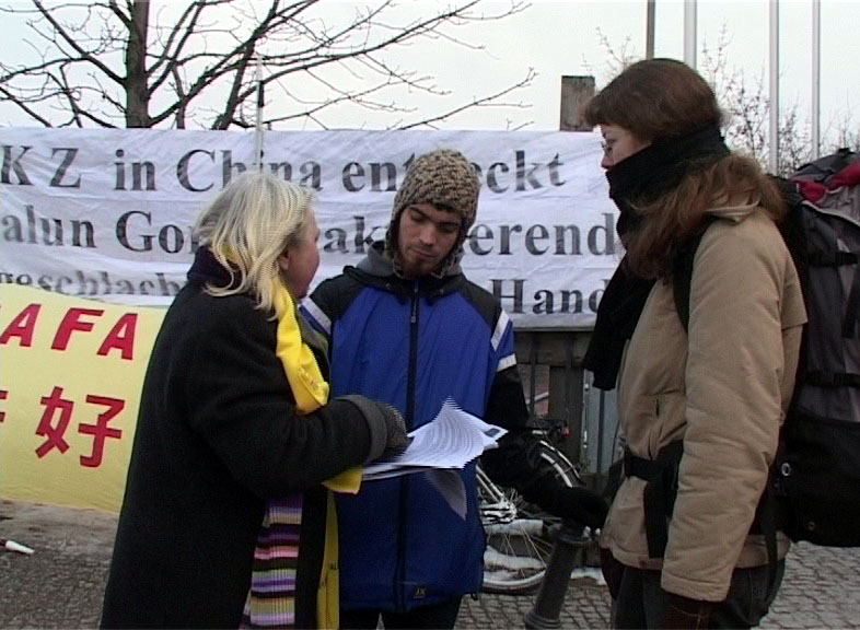 一些行人停下脚步,仔细的观看展板,听学员讲解,接过真相资料及有关苏家屯集中营屠杀并贩卖法轮功学员器官的特别报道。大部份时间里,玛丽亚娜(Marianne)都在和路过的行人讲法轮功被中共迫害和苏家屯集中营的真相。一位经常路过这里的德国男士向玛丽亚娜表示,他被法轮功学员坚持不懈的在中使馆前抗议的坚定精神所感动。当他听说了苏家屯的消息时,震惊之余给法轮功学员出主意,应该把这个消息告诉所有的政治家,他们应该关心这件事。他还表示会把这个消息告诉他的亲朋好友。