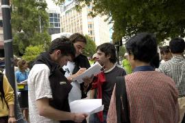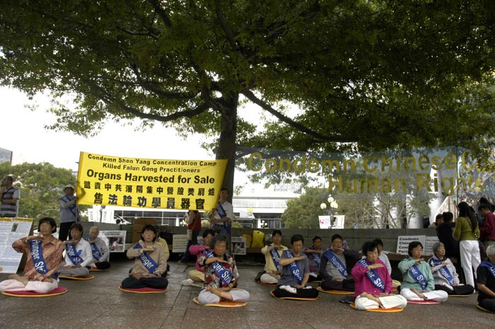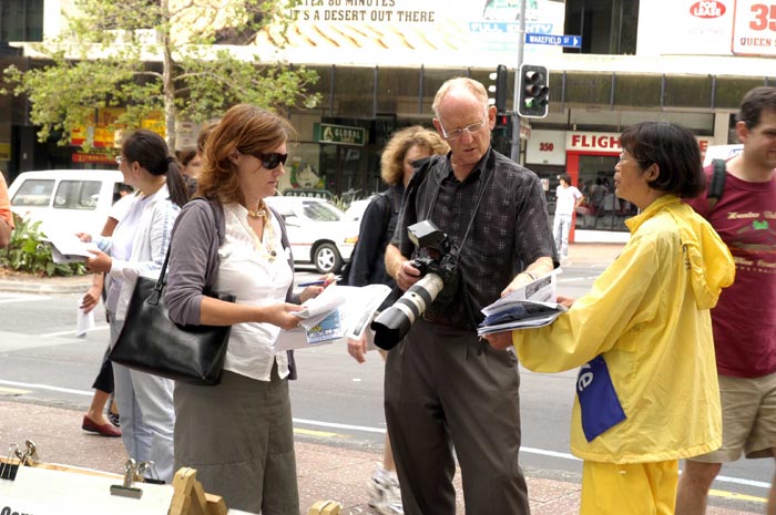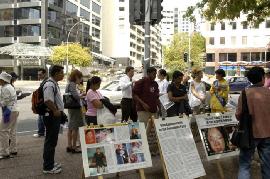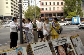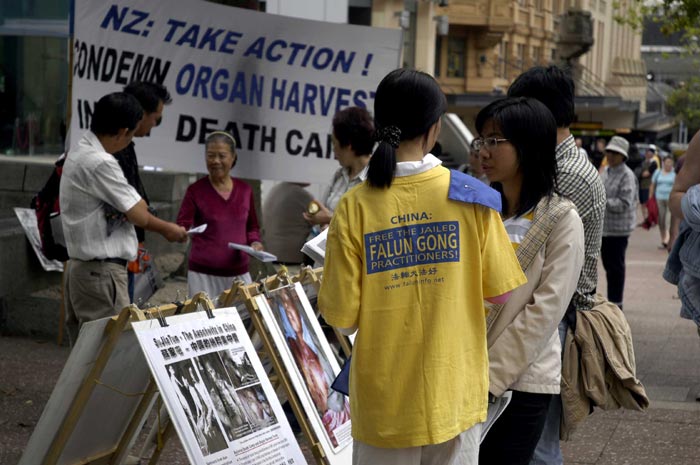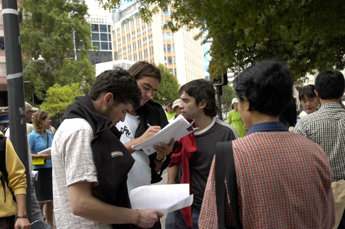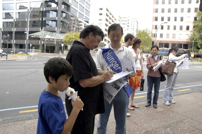 【明慧网2006年3月20日】2006年3月19日中午,来自新西兰奥克兰、汉密尔顿市的法轮功学员在位于奥市的繁华商业街─皇后大街,进行48小时接力绝食抗议,抗议中共在沈阳苏家屯集中营所犯下的售卖法轮功学员身体器官等骇人暴行;同时征集民众签名,届时将递交新西兰政府总理,呼吁政府对中共暴行进行独立调查。