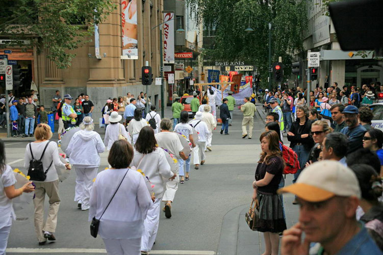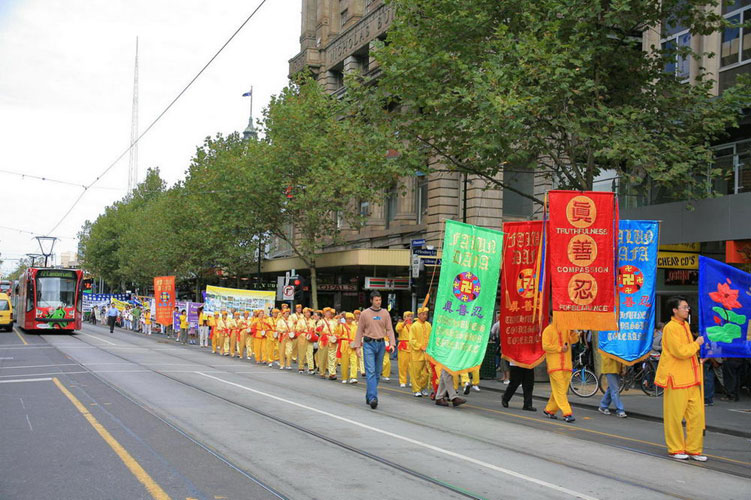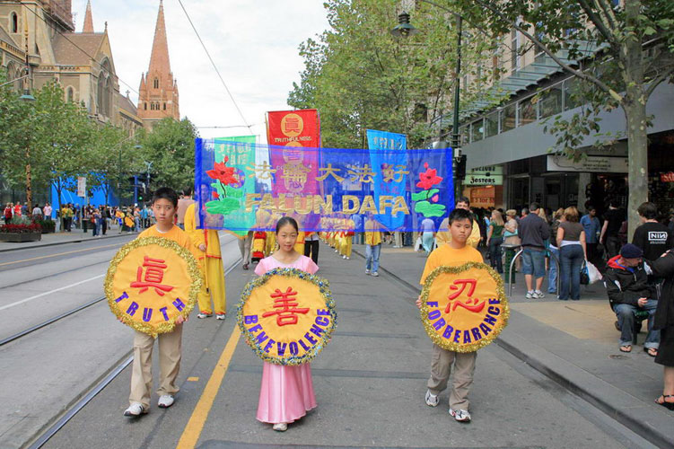 来自五大洲七十二个国家,约三百万民众莅临墨尔本观看比赛。3月18日,法轮功学员在市中心举行盛大游行活动。当天,在墨尔本街头,人头攒动,热闹非凡,众多艺术家展示着精彩纷呈的表演节目。整座城市沉浸在喧哗欢闹之中。伴随着整齐威仪的法鼓声和“法轮大法好”的音乐声,警车开道,由近百位法轮功学员组成的法轮大法游行队伍从街心走了过来。整座城市仿佛霎时间安静下来,人们停止喧哗,屏息注视这一支非凡的游行队伍。