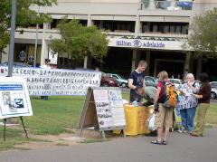 当人们听到中共从法轮功学员活体上割取器官出售,而后焚尸灭迹的惨绝人寰的事件,无不感到震惊,纷纷接受真相资料或签名声援。有一位年轻西人看了资料后不敢相信会有这样的事情发生,询问是真的吗,他不断的说“太可怕了”。他问他能做什么来帮助受迫害者,一个学员告诉他可以写信给加拿大总理,让政府知道在中国正发生的这个罪行。他连连说,我会的,“我会给他们所有的人写信”。