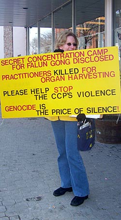 ![]() 金娜德手持展板在寒风中。展板写着:秘密集中营曝光,法轮功学员遭摘取器官后被杀,请帮助制止中共的暴行,沉默的代价是大屠杀。 |