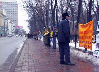【明慧网2006年3月21日】2006年3月18日上午11点,乌克兰基辅法轮功学员在中共使馆前举行集会,抗议中共秘密设立苏家屯集中营,虐杀法轮功学员,活体摘取器官并出售的血腥兽行。