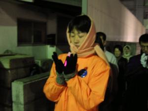 春寒料峭,法轮功学员举着横幅,手持萤光棒,直到深夜。